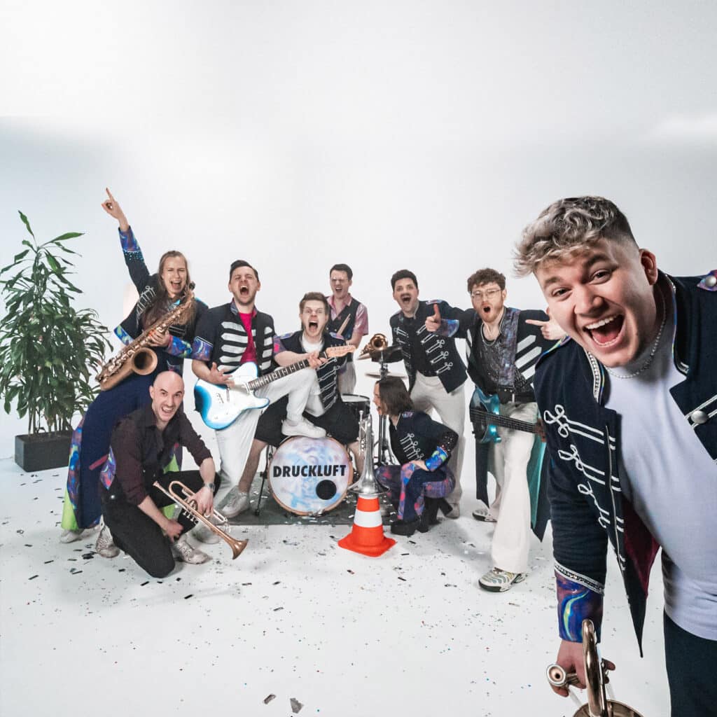 Ob eigene Songs oder kreative Brass‑Covers: Druckluft liefert eine Show, die man nicht nur hört, sondern spürt – farbenfroh, dynamisch und voller positiver Energie.